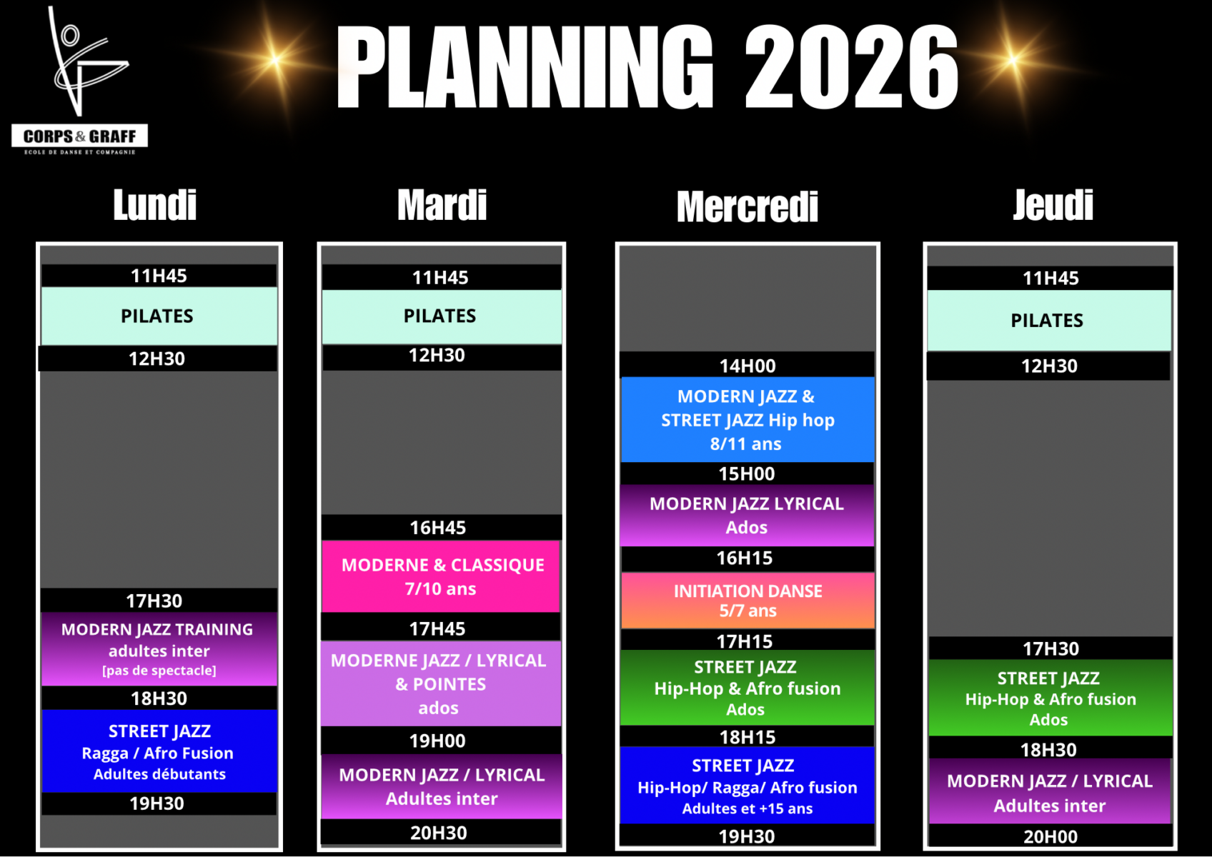 Eveil corporel 4/5 ans, Initiation danse 6/7 ans, Moderne, Jazz, Classique, Street jazz, Lyrical, Contemporain, Hip-Hop New style, Ragga Dance hall, Afro fusion… Ainsi que des Ateliers, Open Class & Stages…