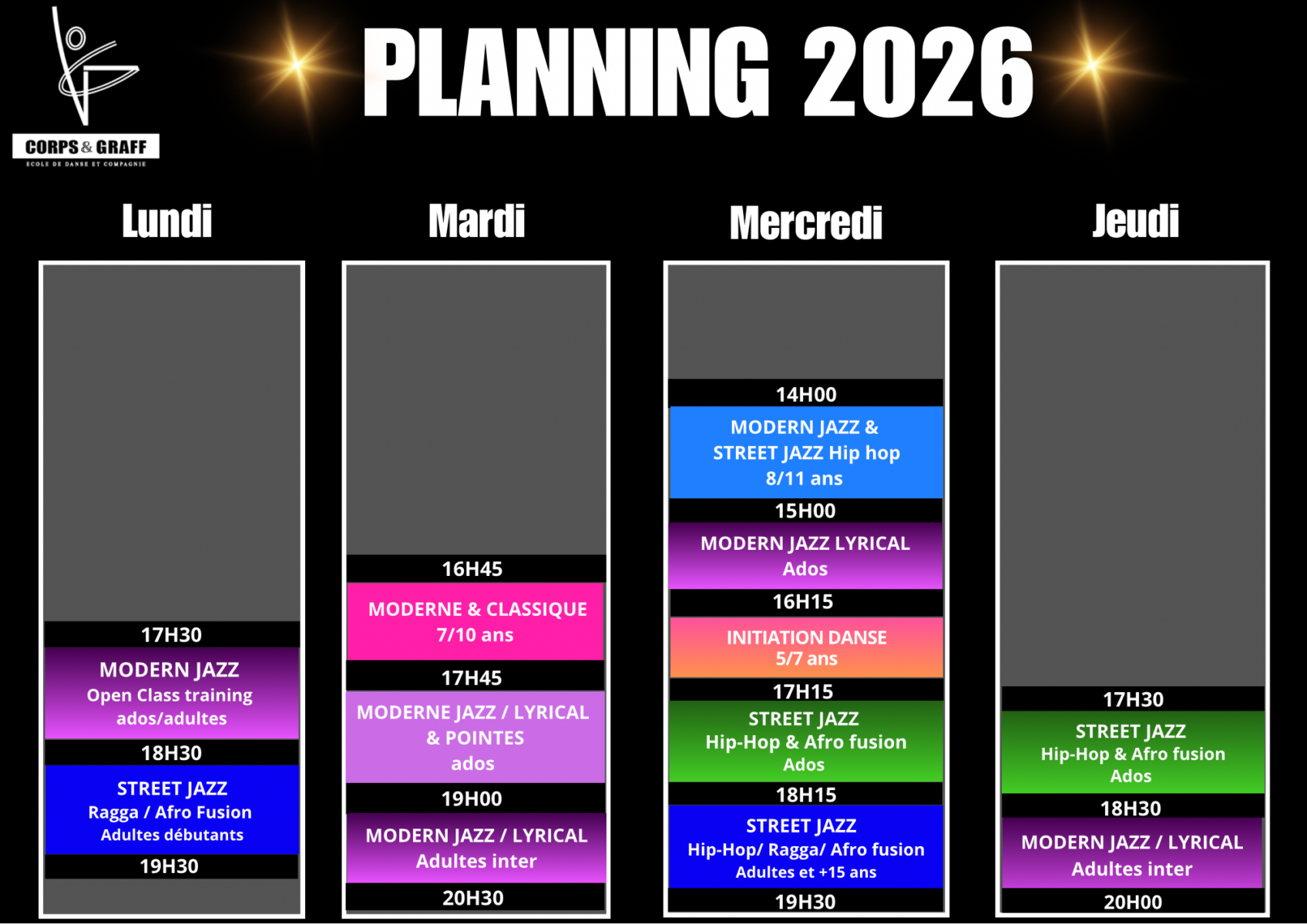 Eveil corporel & Initiation danse 5/7 ans, Moderne, Jazz, Classique, Street jazz, Lyrical, Contemporain, Hip-Hop New style, Ragga Dance hall, Afro fusion… Ainsi que des Ateliers, Open Class & Stages…